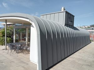 Il progetto ha richiesto una lavorazione complessa e interamente su misura, con lastre preformate in officina e montaggio in opera con agganci nascosti, garantendo continuità estetica e protezione dagli agenti atmosferici.